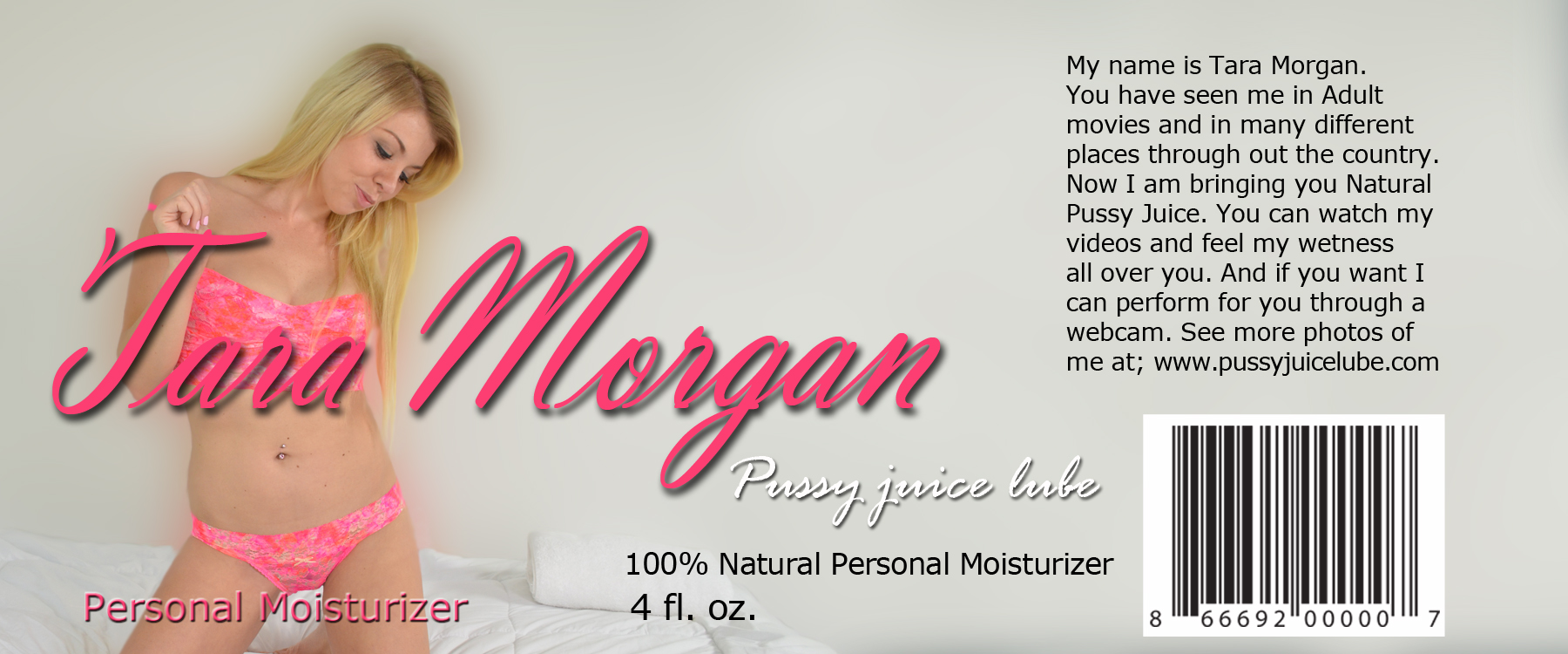 Have you ever dreamed of making love to Tara Morgan? Or have you made love to a porn star and would like to feel her warm juices all over your sensitive penis? Then this premium personal moisturizer is what you will need to enhance your sexual pleasure and achieve the ultimate ecstasy. All of our moisturizers are fully guaranteed to be the best personal moisturizer you have ever felt, while providing you the real feeling only available with natural real live sex. This moisturizer is unique and comes with a written letter featuring private pictures of Tara Morgan so you can see how beautiful and sexually appealing the moisturizer's donor is. For your privacy and discretion we have redesigned our bottles to only display necessary information about the personal moisturizer. FREE SHIPPING IN THE CONTINENTAL UNITED STATES!